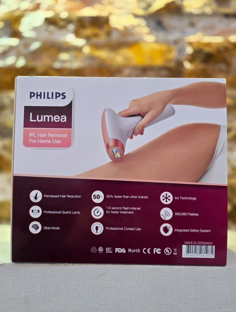 دستگاه حذف موهای زائد با تکنولوژی IPL از برند فیلیپس، مدل Lumea را نشان میدهد. این دستگاه برای استفاده خانگی طراحی شده و با پالسهای نوری، رشد مو را کاهش میدهد.